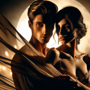 As moonlight filtered through the lace curtains, Luca pulled Anna close on the bed, their lips meeting in a kiss that tasted of sweet wine and longing. His tongue danced with hers, salty-sweet, while his hands roamed her back, feeling the warmth of her skin. She gasped softly, her breath a whisper against his ear, as he trailed kisses down her neck, inhaling the faint floral scent of her perfume mixed with her natural musk.